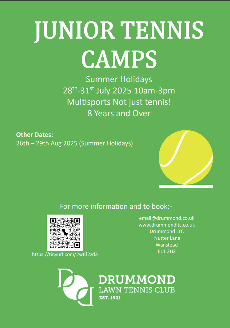 Drummond Lawn Tennis Club will be running a series of Holiday Camps from the 28th July to the 31st July. The camps will run from 10am until 3pm and will include other sports apart from tennis. There are only 12 spaces per day available. https://clubspark.lta.org.uk/DrummondLTC/Coaching/Camp/8b2774d3-1dd3-4f12-af78-95a3a7555073?location=