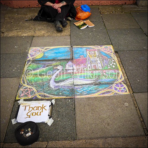 Geoff Wilkinson writes on Wanstead Daily Photo: “I haven’t seen this for years, not since I was a child, a pavement artist working in chalk. I remember seeing them on days out in ‘the West End’ but on Monday I came across one here in Wanstead High Street. I asked the gentleman about the picture he had drawn, he explained that ‘it was a generic English scene not of anyone place’ and invited me to take a picture. His skill in calligraphy was also obvious as you can see by the ‘thank you’ note next to his hat. He was reading, I enquired about the book, he explained that it was about Medieval architecture and garden design. I said goodbye and left him in peace to continue reading his book.”